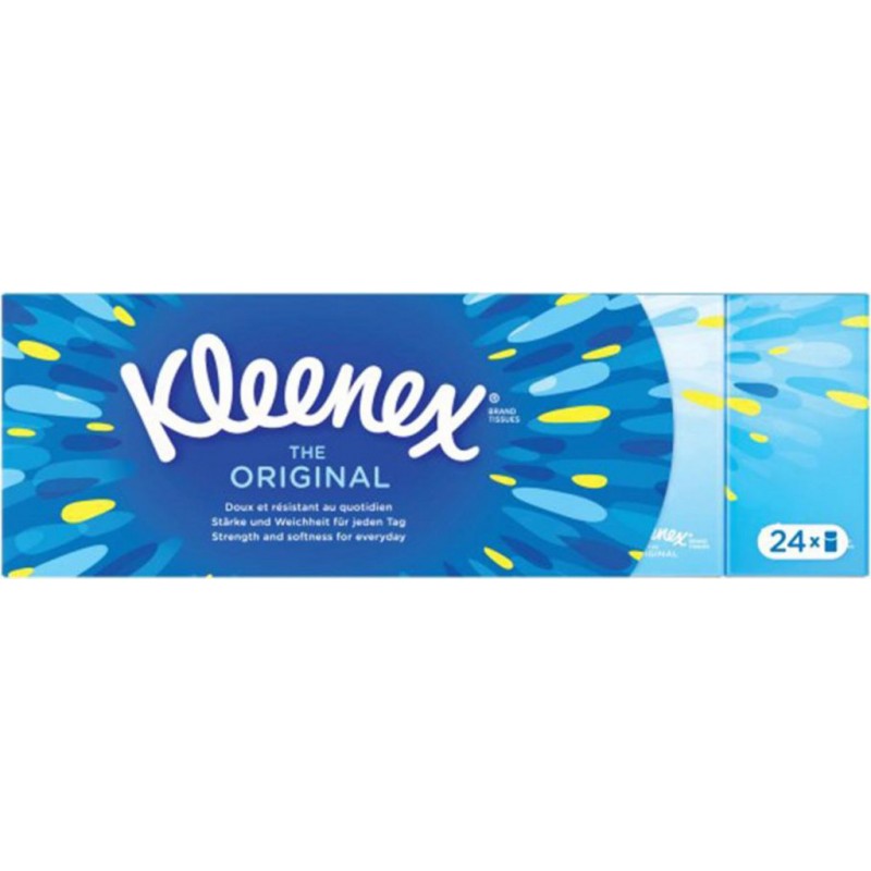 Kleenex® Original est le mouchoir historique de la marque. À la fois doux et résistant, il est à nos côtés, au quotidien, depuis 1924. Lot économique de 144 étuis. Pâte à papier. Produit unitaire EAN 3034250007820, lot de 6 EAN 3701018095978.